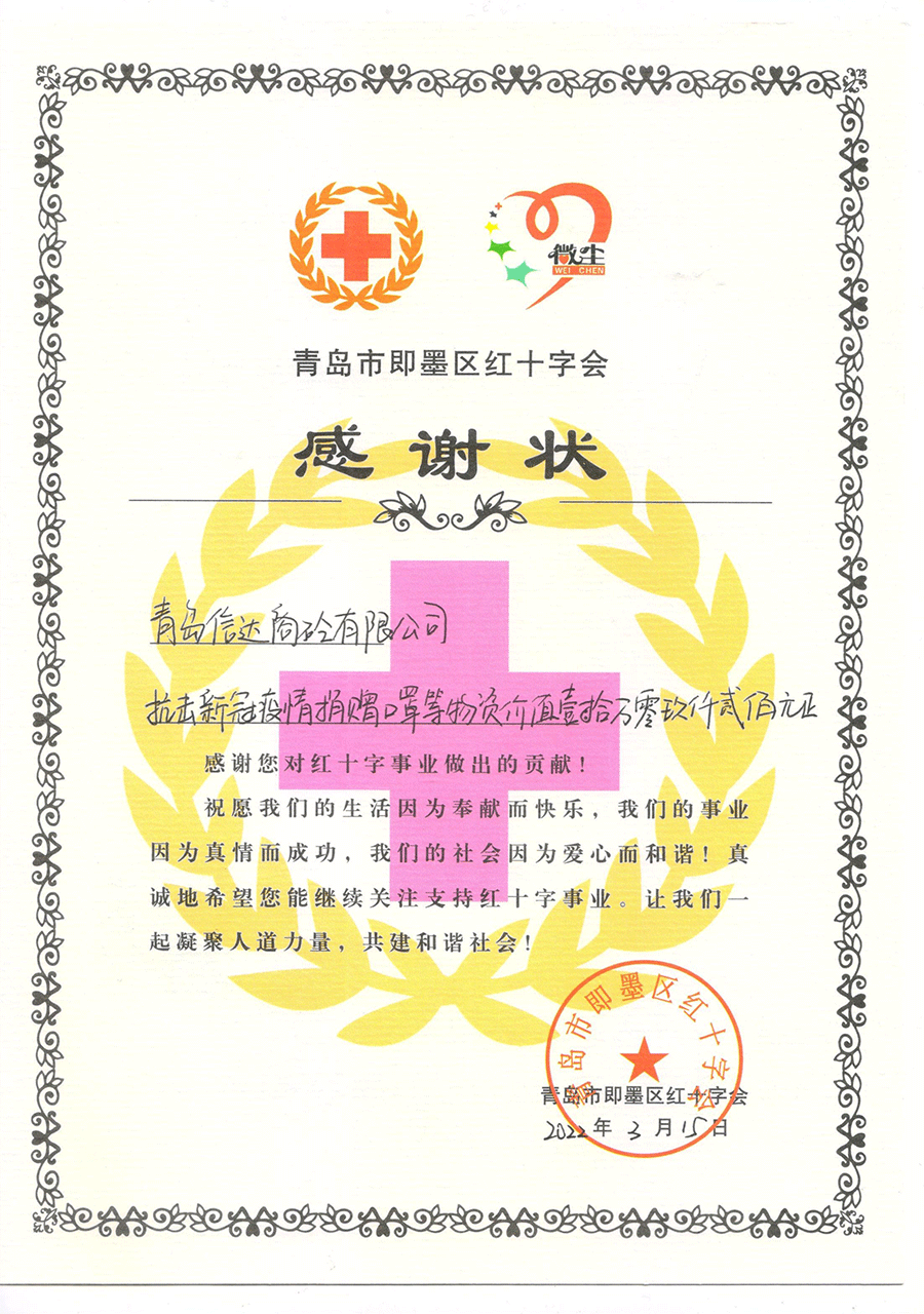 3月15日下午, 我公司信达商砼通过即墨区红十字会定向向通济街道、北安街道、潮海街道、环秀街道、龙山街道、灵山街道、段泊岚镇等共10家镇街、园区及单位,捐赠口罩12万个,防护服2400套,防护鞋2400双,价值共计10.92万元,助力即墨区疫情防控。